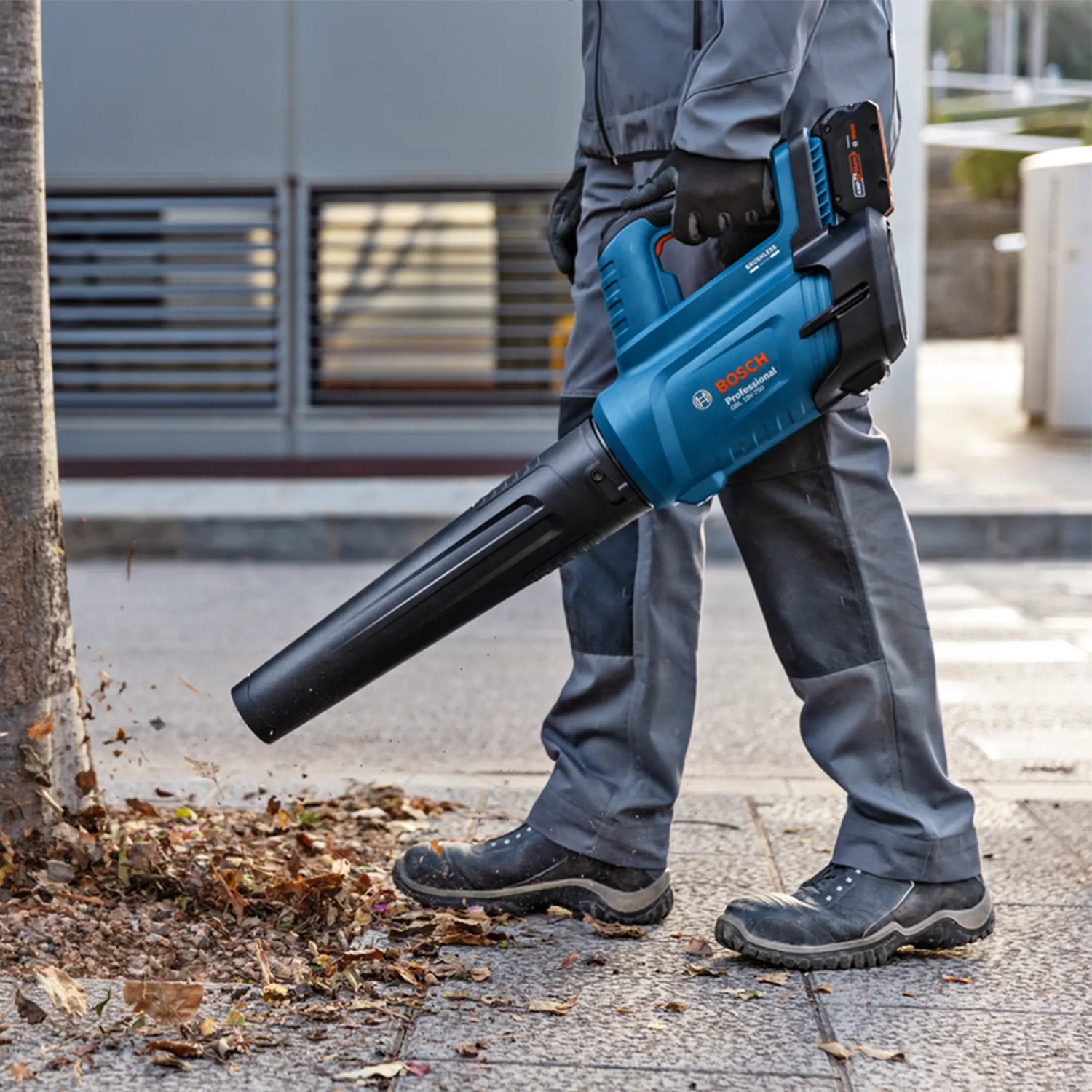 The Battery-powered blower Bosch GBL 18V-750 It is the perfect ally for quickly and effortlessly clearing leaves, debris, and debris from gardens, driveways, and green areas. Thanks to the powerful brushless motor combined with a axial fan, offers a maximum air flow of 780 m³/h and one air speed up to 198 km/h, all with a balanced and easy to handle structure.