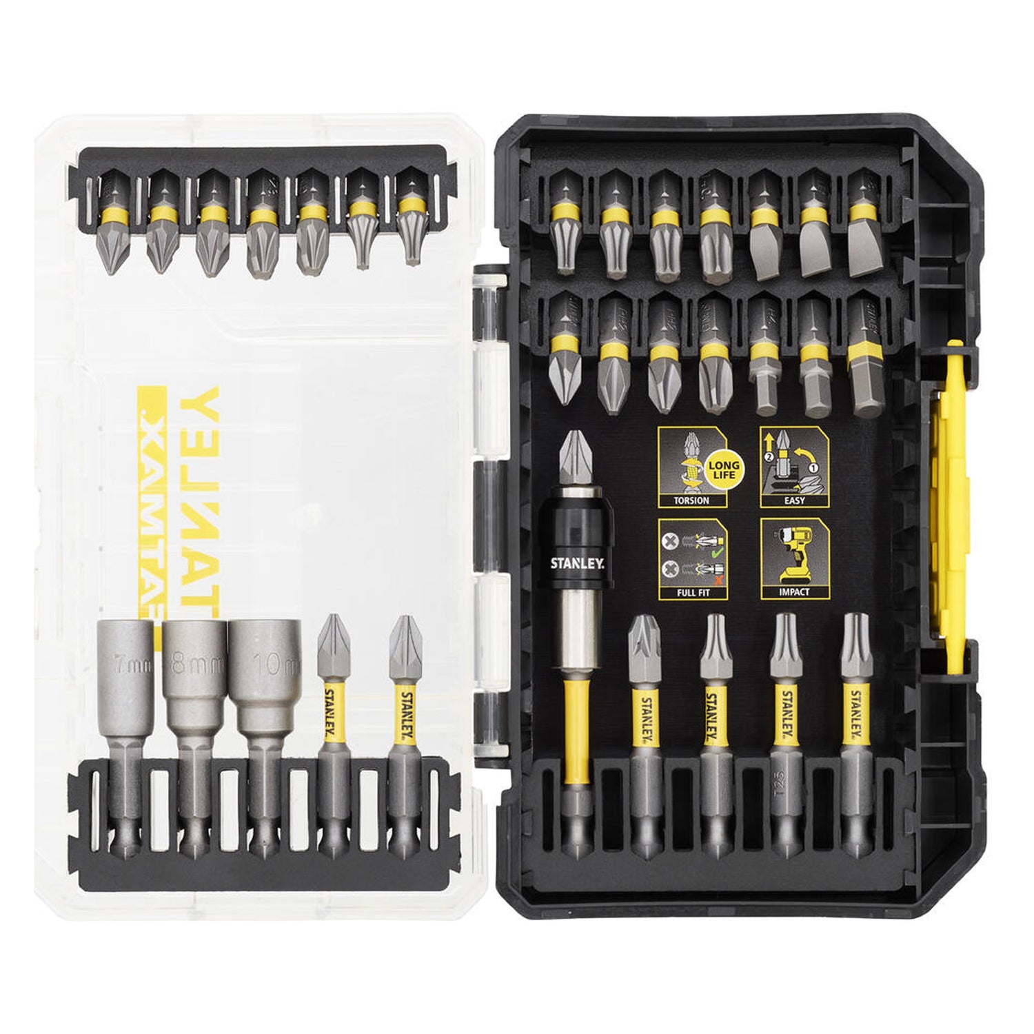 - 22 x 25mm inserts: 2× PZ1 - 2 PZ2 - 2× PZ3 / PH1 - 2× PH2 - PH3 / T10 - T15 - T20 - T25 - T30 - T40 / HX4 - HX5 - HX6 / SL4 - SL6 - SL8