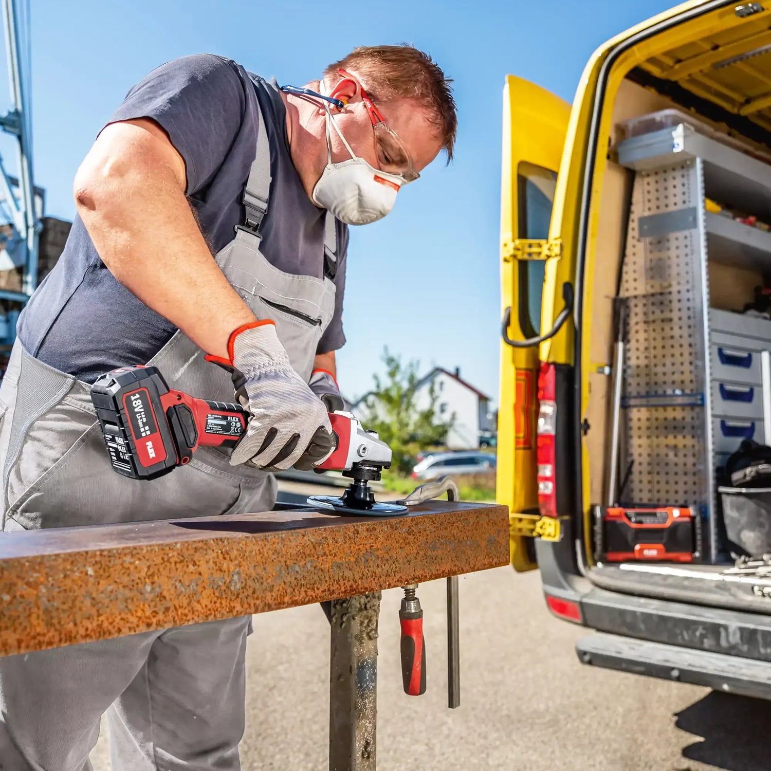 Angle grinder Flex LBE 125 18.0-EC C battery operated with variable speed and brake 18.0 V, 125 mm. The Electronic Management System (EMS) protects the machine, prolonging its life and increasing its efficiency.