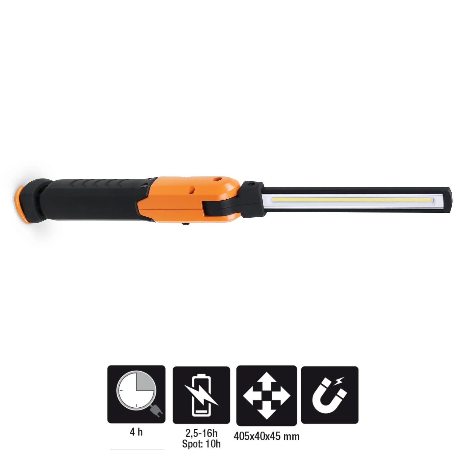 Equipped with powerful neodymium magnetic base, swivel hook, Continuous brightness regulation And dust, shock and splash resistance, is a high-end inspection lamp for daily use in workshops, construction sites or technical plants.