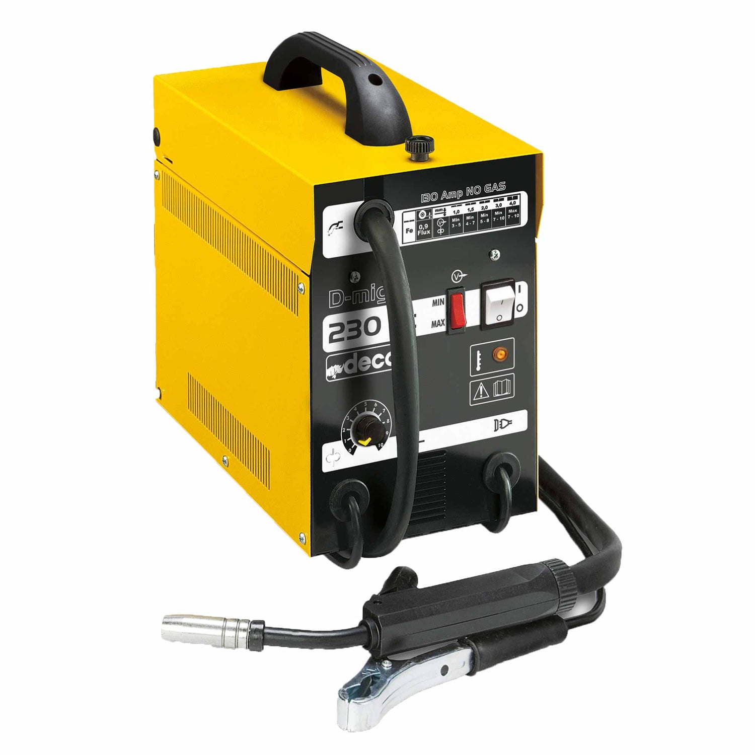 Welding plant Deca D-MIG 230 AC, wired NO GAS 1Ph - 230V 50/60 Hz. The D-MIG 230 AC supplies 130 Amps in alternating current.
