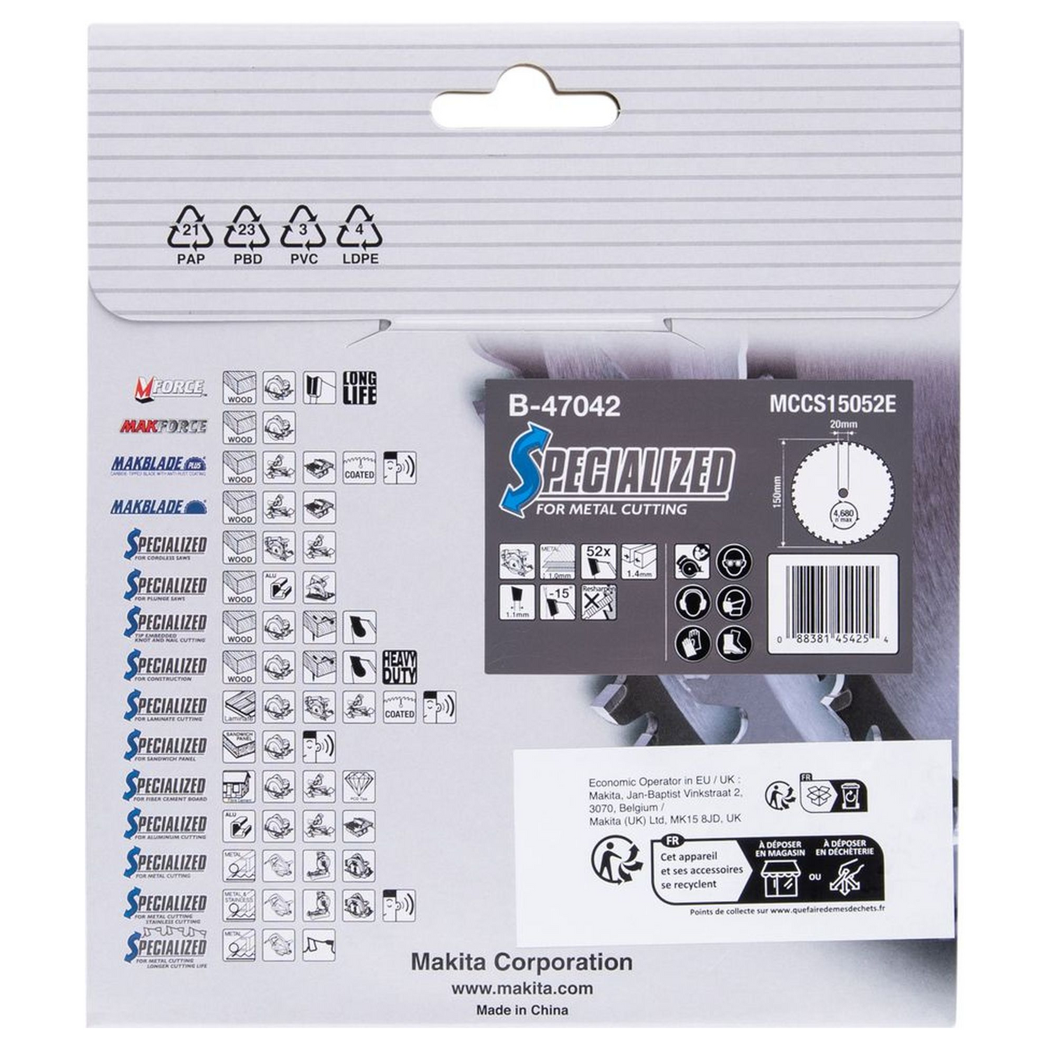 Circular Saw Blade Makita B-47042 Specialized TCT 150mm 52T for professional metal cutting. Tungsten carbide teeth for exceptional durability.