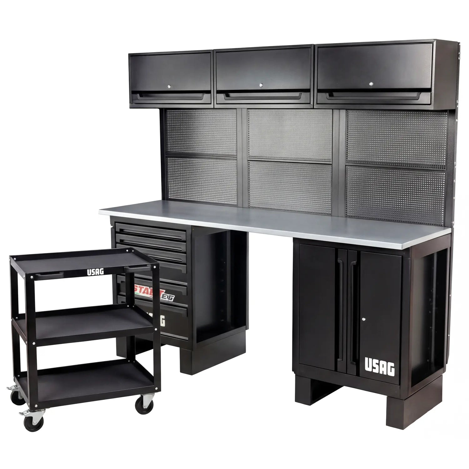 L’Usag 516 SA/STBM serve per allestire una postazione da lavoro professionale in officina meccanica, reparto manutenzione o centro assistenza, offrendo mobili con cassetti e ante, pannello forato portautensili, pensile superiore e carrello multiuso a 3 ripiani per avere utensili e materiali sempre ordinati e a portata di mano.