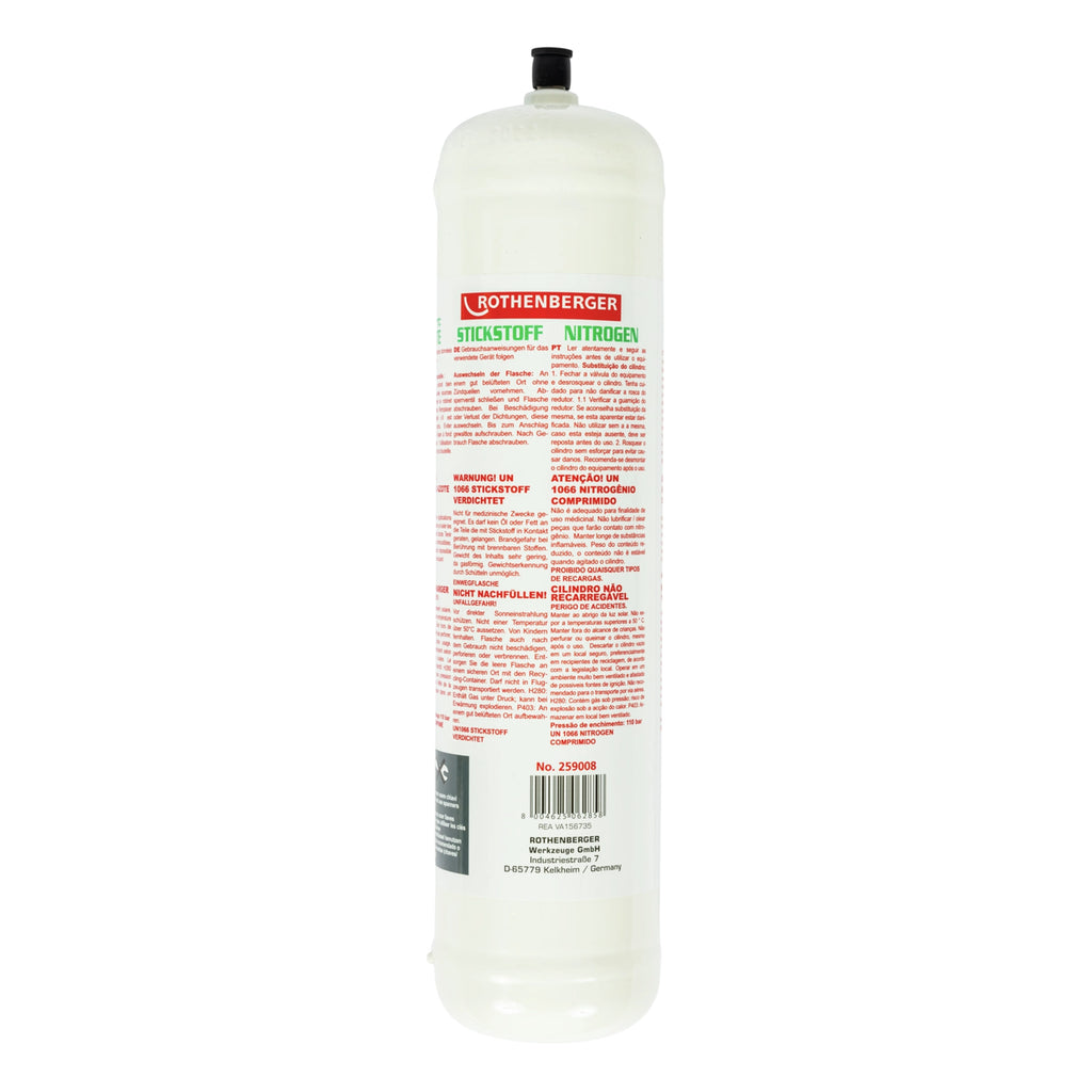 Bombola di azoto Rothenberger 950 cm³ 110 bar, bombola di azoto ideale per applicazioni su impianti di condizionamento, refrigerazione e su pompe di calore. Per la ricerca di perdite e il flussaggio nella fase di saldatura.