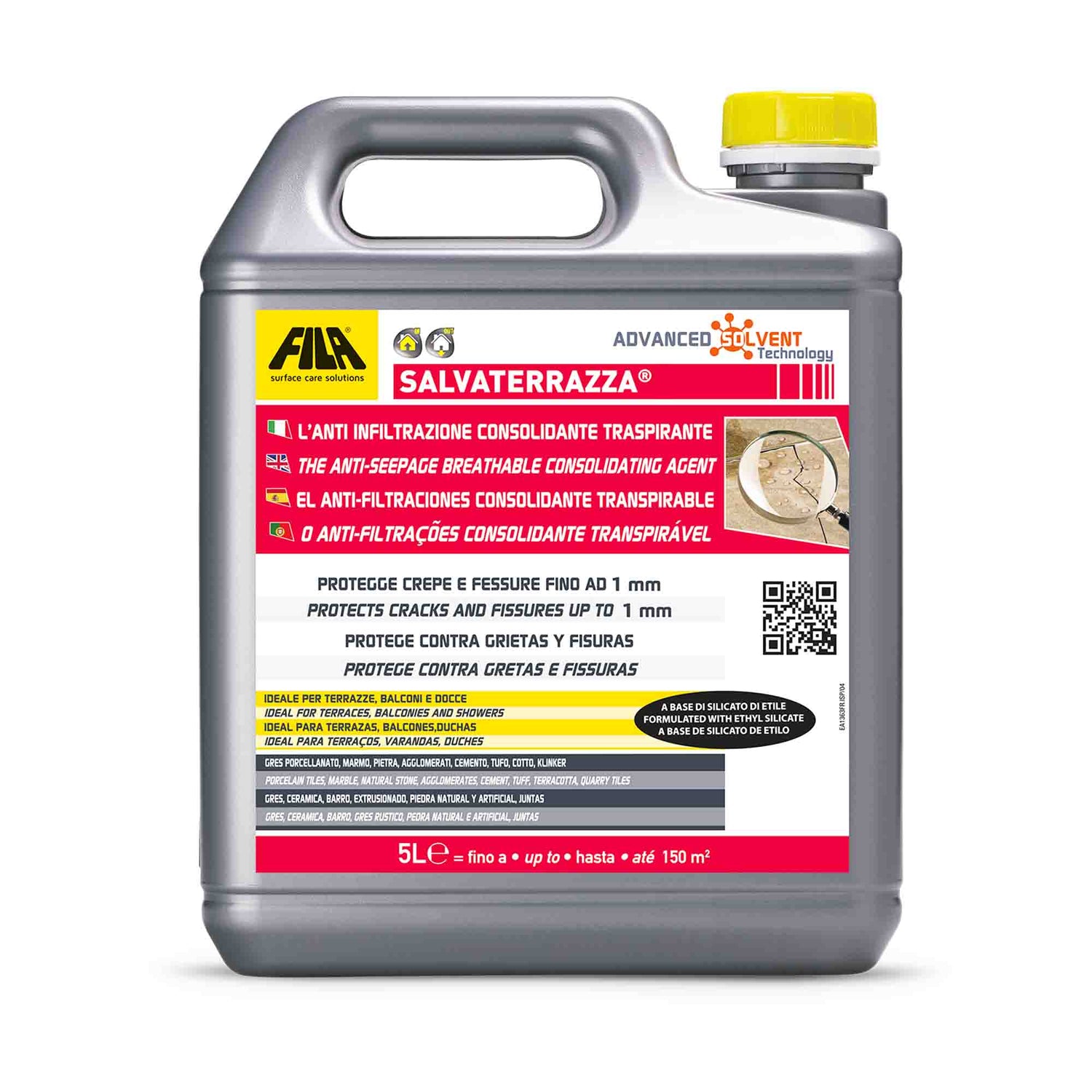 Impermeabilizzante anti infiltrazione Fila SALVATERRAZZA, consolidante e traspirante. Ideale per gres porcellanato, marmo e pietra, agglomerati, cemento, tufo, cotto, klinker.